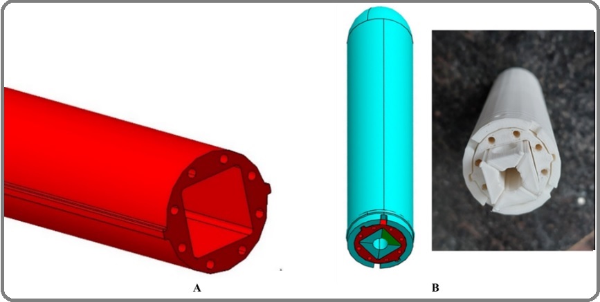 The internal body is developed to accommodate eight peripheral catheters at an appropriate distance of 12mm from the central source, spaced 45o apart, with 300 curvatures at the tip. Two sets of four detachable components for in vivo dosimetry (IVD) were created, one for TLD capsules spaced 10mm apart and another for inserting Gafchromic film in the source axial direction with a length of 125mm. In the absence of in vivo dosimetry, these detachable components can be filled with a compensatory substance. Once all four components have been inserted and the cap has been affixed to hold them in place. Both the side of the fixation cap, fixation buttons were placed to fix the catheter. The catheter position and reproducibility tests were done by autoradiograph method. The central tandem can go through the cavity produced at the center (Figures 1 and 2).