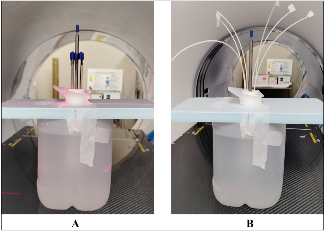 Figure 3. Phantom with Applicator, Central Tandem and Needles at the Peripheral Channels (A) and Flexible Catheters at the Peripheral Channels (B).