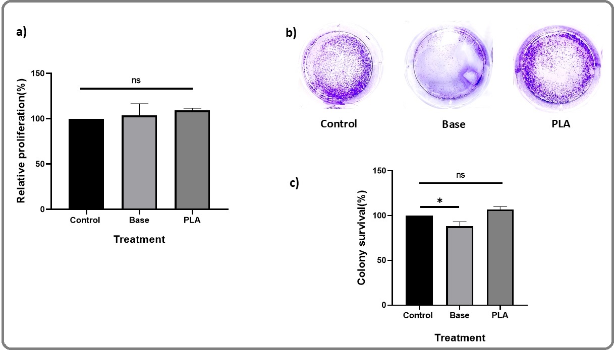 Figure 6. PLA is Biocompatible to the Cells. a) MTT assay showing relative cell proliferation (%) of L929 cells at 24 h of incubation. Data are represented as mean ± SD (n =3). (b) Representative images from the Clonogenic assay. (c) Quantification of colony formation expressed as relative colony number.
