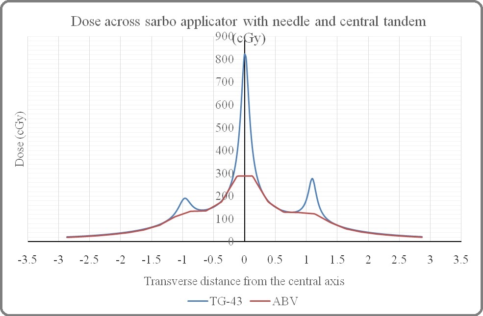Figure 7 shows TPS calculated dose across the sorbo applicator with needle using TG-43 (blue) and BVAcuros (red).