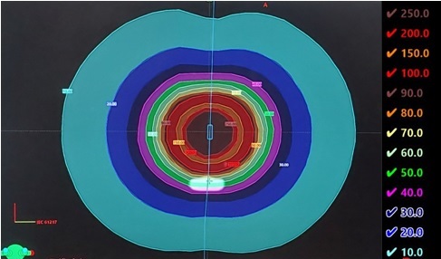 The dose rate fall-off remained consistent whether the dose was 1Gy or 10Gy. Furthermore, the distance between the 100% and 90% isodose lines is only about 1 mm, whereas the distance between the 20% and 10% isodose lines is substantially longer, roughly 18 mm. This demonstrates that the rate of fall-off at higher dose levels is sharper than at lower dose levels, which is gradual.