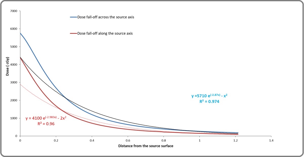 Because of the source’s self-attenuation, an anisotropic dose distribution was observed, as shown in Figure 8, resulting in varying levels of exponential decay with respect to dose at the source’s outer layer along different axes. Figure 9 depicts the observed dose fall-off along and across the source axis from the source’s outer layer.