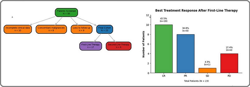 Figure 1. Patient Flow and Treatment Response. (A) Flow chart depicting patient inclusion and exclusion criteria, leading to the final cohort of 23 Hodgkin lymphoma patients analyzed in the study. (B) Bar graph illustrating treatment response after first-line therapy according to RECIST 1.1 criteria. The overall objective response rate (ORR) was 78.3%, comprising complete response (CR; 43.5%), partial response (PR; 34.8%), stable disease (SD; 4.3%), and progressive disease (PD; 17.4%).