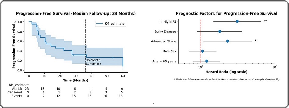 Figure 2. Progression-Free Survival (PFS) and Prognostic Factors. (A) Kaplan-Meier curve showing progression-free survival over a median follow-up period of 33 months (interquartile range 31–38 months). Cumulative incidence of disease progression or relapse events (17.4%) is indicated. (B) Forest plot summarizing univariate Cox proportional hazards regression analysis for predictors of PFS. Hazard ratios (HR) with 95% confidence intervals (CI) are displayed for variables including age, Ann Arbor stage, bulky disease, International Prognostic Score (IPS), sex, histologic subtype, and presence of B symptoms. Significant associations with poorer PFS were observed for increasing age, advanced stage, bulky disease, and high-risk IPS (≥3).