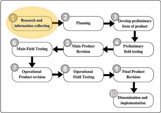 The research method refers to the cyclical stages of the Borg & Gall Research and Development Model, which include information gathering and research, planning, development of initial product prototypes, and conducting operational field tests (Figure 1).