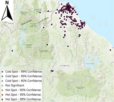 Figure 1. Hot Spot Analysis Showing Spatial Distribution of All Breast Cancer Cases at HPUSM, with Clustering in Northern Kelantan.