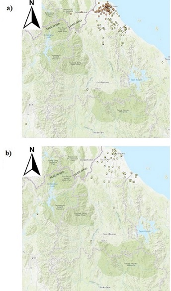 GIS software, including ArcGIS version 10.7 and QGIS version 3.12.1, was used for spatial and zonal analysis, including Z-score calculations [9]. Spatial analysis methods applied in this study included the Average Nearest Neighbour (ANN) and Hot Spot Analysis (Getis-Ord Gi*). The Average Nearest Neighbour determined whether case distributions were clustered or random, while Getis-Ord Gi* provided a Z-score to indicate spatial clustering of high or low values. A higher Z-score represented stronger hot spot clustering. Both analyses were performed to achieve the study objectives. The geographical coordinates were projected using the GDM2000 coordinate system, and Euclidean distance (straight-line distance) was used as the distance metric for all spatial calculations.