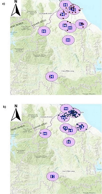 Figures 3 a) and b), generated using ArcGIS, illustrate the number of patients residing within a 10 km radius of the nearest available hospitals.