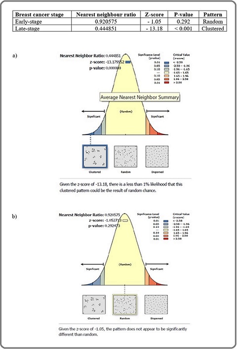 Figure 4. a) Average Nearest Neighbour Summary for Late-Stage Breast Cancer Patients in HPUSM, b) Average Nearest Neighbour Summary for Early-Stage Breast Cancer Patients in HPUSM.