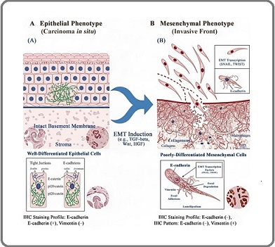 Cancer cell migration and invasion are complex processes involving multiple mechanisms that enable tumor cells to escape from primary sites and metastasize [104,111]. These processes exhibit plasticity and adaptability, allowing cancer cells to respond to microenvironmental cues and overcome therapies [104, 112]. The primary mechanisms include collective, mesenchymal, and amoeboid cell migration, distinguished by cell-cell junctions, actin cytoskeleton organization, matrix adhesion, and protease activity [112]. Cancer cells can transition between these migration modes, demonstrating plasticity that helps them navigate microenvironments and evade therapies [112, 113]. Migration and invasion involve interplay between cellular components and signalling pathways, including cytoskeletal remodeling, ECM degradation, and cell adhesion changes [108, 111]. Cross-talk between the ECM, integrin receptors, matrix metalloproteases, and Rho GTPases modulates cell shape, tension, and migration [108]. The tumor microenvironment influences collective tumor cell invasion [114]. This plasticity manifests itself as histopathological changes. During Epithelial- Mesenchymal Transition (EMT), epithelial cells lose polarity and cell-cell adhesion while gaining mesenchymal markers, thereby driving invasion [115]. This process is visible at tumor ‘invasive fronts.’ Tumor grading reflects this process, with high-grade tumors showing loss of epithelial architecture and a discohesive appearance consistent with EMT, indicating an invasive potential [116] (Figure 1).