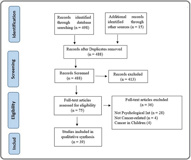 The study selection process is detailed in Figure 1. Our systematic search of databases initially identified 498 records, with an additional 15 records sourced from other references, yielding a total of 513 publications. After the removal of 25 duplicates, 488 unique records were screened based on their titles and abstracts. This led to the exclusion of 413 records that did not meet the inclusion criteria. The remaining 75 full-text articles were thoroughly assessed for eligibility. Of these, 36 were excluded for the following reasons: the intervention was not psychosocial (n=28), the study was not related to adult cancer patients (n=4), or the population involved pediatric cancer (n=4). Consequently, 39 studies were deemed eligible and included in the qualitative synthesis of this systematic review.